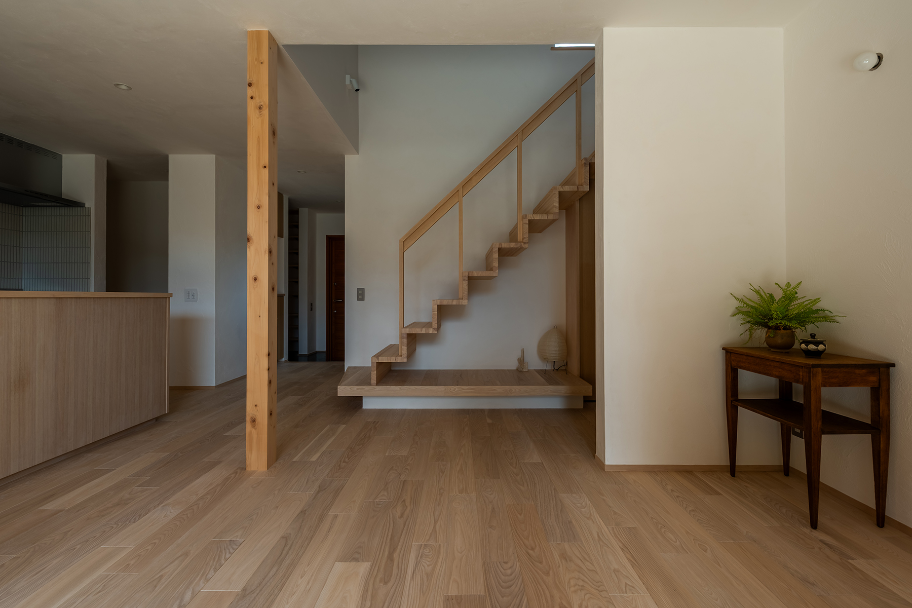 閑静な住宅街に建つ、二階建ての住まい。裏を流れる小川の音や、山の匂いが、日々の暮らしにやさしく溶け込みます。