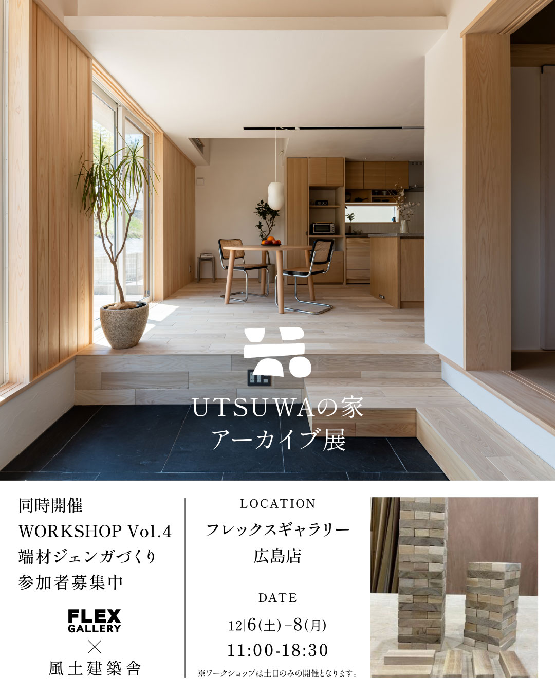 インテリア・ライフスタイルショップFLEX GALLERY広島店様2階スペースにて、UTSUWAの家アーカイブ展と、端材ジェンガづくりワークショップを開催します。無垢床や漆喰などを使用した素材感を感じられる住まい、豊かな暮らしを実現する実例を展示しています。