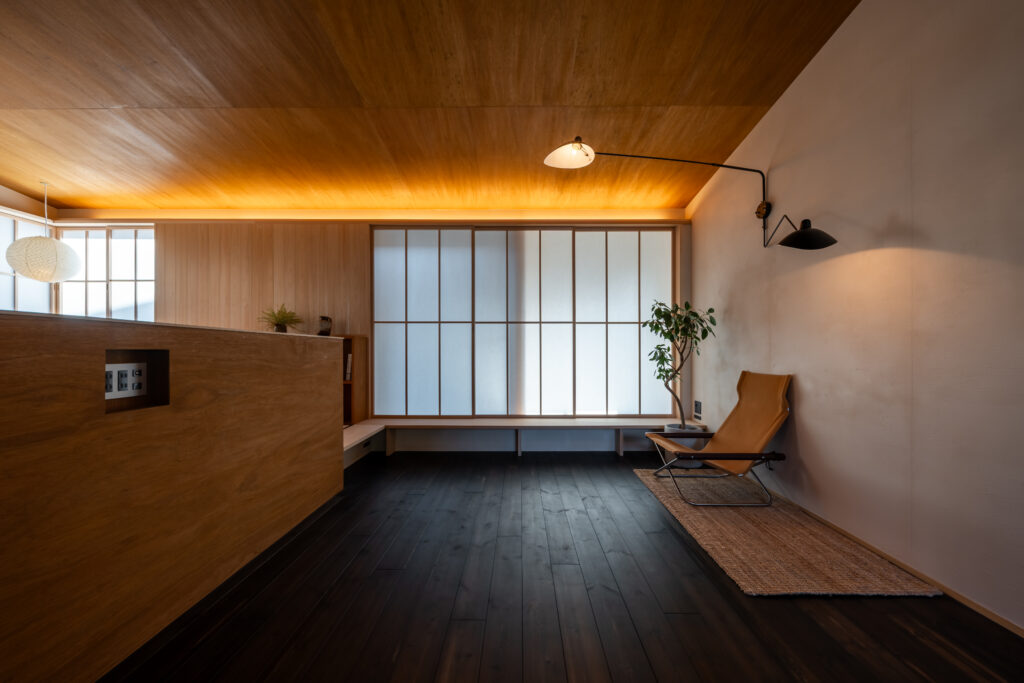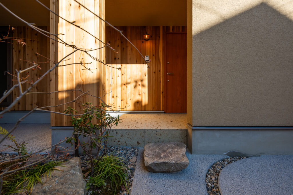 外壁には土色の塗り壁と天然木張り仕上げ。アプローチにある植栽を活かし、帰る度に心休まる佇まいとしました。1階は天井を低くすることで、懐かしみのあり落ち着いた空間としました。2階リビングの良さを最大限活かすために勾配天井とし、開放的なLDK空間をつくりました。